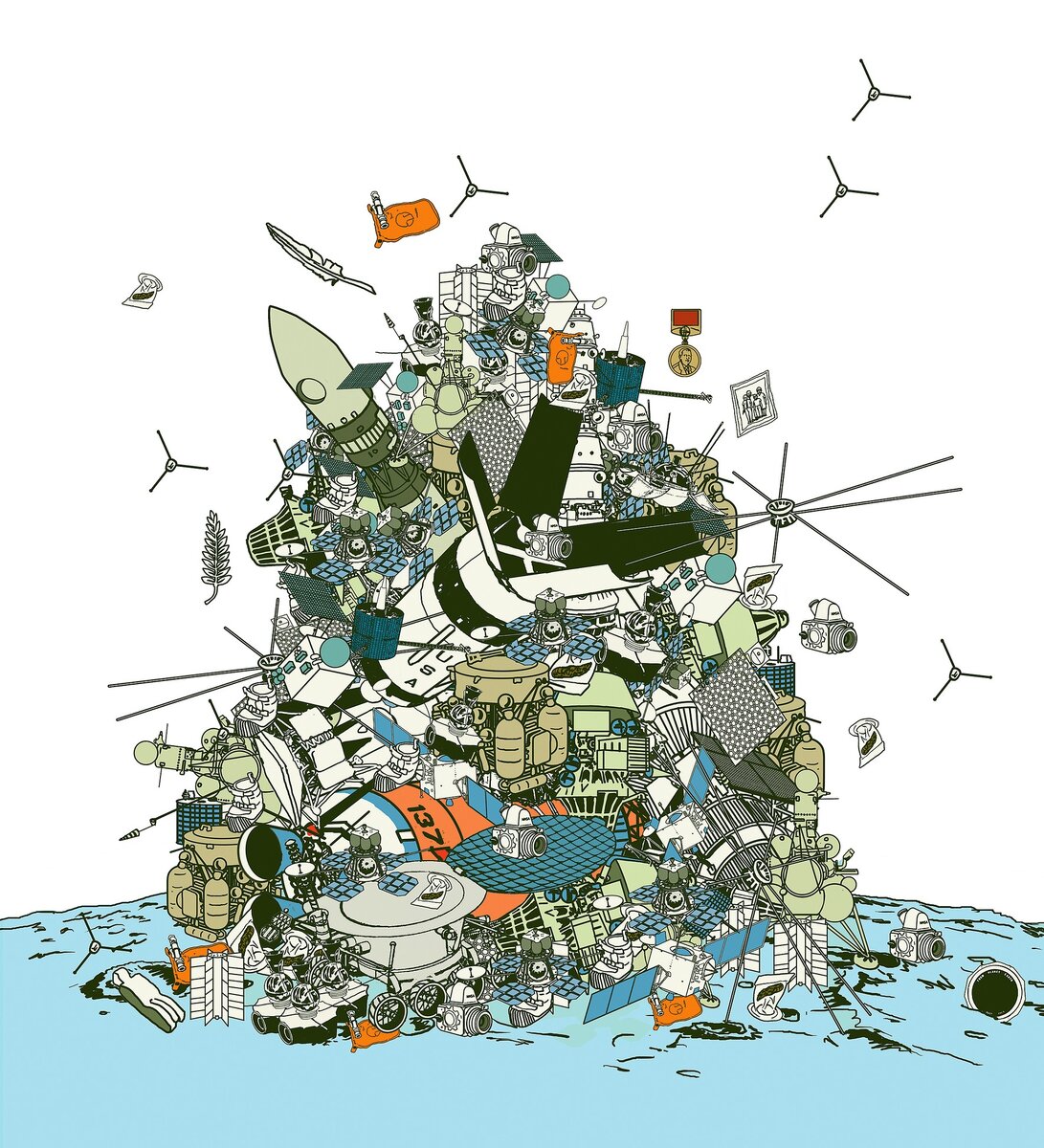 Чтобы как следует замусорить поверхность Луны, человечеству понадобилось всего 57 лет: сейчас на спутнике находится почти двести тонн вещей с Земли. Esquire посмотрел, какие именно. 96 мешков с мочой и калом астронавтов, 74 межпланетные станции, спускаемых аппарата и модуля, 12 фотокамер Hasselblad, 12 пар лунных ботинок, 9 подлокотников, 6 луноходов, 6 выцветших нейлоновых флагов США, 5 уголковых отражателей, 2 гамака, 2 мячика для гольфа. Кроме того: дротик для дартса, телекамера, дрель, соколиное перо, флаг ООН, алюминиевая скульптура «Павший астронавт», золотая оливковая ветвь, золотой телескоп, серебряная булавка, памятные медали с изображениями Юрия Гагарина и Владимира Комарова, силиконовый диск с посланием 73 мировых лидеров, семейная фотография астронавта Чарльза Дьюка. А также неизвестное количество ядерных отходов с плутонием-238 и полонием-210, молотков, плоскогубцев, грабель, лопат, батареек, контейнеров для еды, канистр, грязных полотенец, влажных салфеток, рюкзаков, фото
