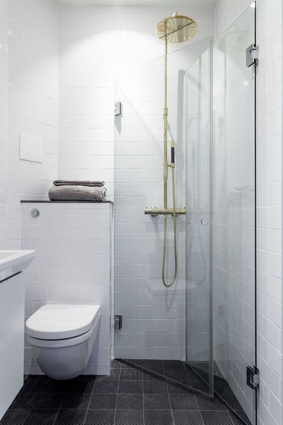 Маленькая ванная комната с душевой - это пространство, которое должно быть максимально функциональным, и при этом сохранять эстетику. Настоящие дизайнеры знают, что это возможно. В нашей подборке 5 советов от дизайнеров, которые помогут вам избежать самых популярных ошибок в ремонте маленькой ванной комнаты. №1: ИГРАЙТЕ ПО-КРУПНОМУ Возможно, после выбора маленьких раковины и перегородок для душевой вам захочется подобрать к ним маленькие смесители и краны. Этого делать не стоит, мелкие детали будут делать визуально ваше пространство еще меньше! (как бы странно это не звучало). Выбирайте стильные переключатели и лейку для душевой полноценного размера - это будет смотреться намного лучше. №2: МНОГОФУНКЦИОНАЛЬНЫЕ ВЕЩИ Даже если вы поклонник минимализма, в маленькой ванной вам прийдется хранить множество вещей. Полка вместо тумбы под раковиной - просто не ваш вариант. Но это не значит, что красивая мебель под раковиной или зеркало с шкафчиком будут смотреться не так изящно. Кстати говоря,