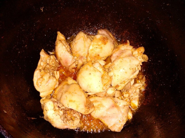 У нас тут начался сезон кабачков, так что я пошарился по интернетам в поисках какого-нибудь новенького рецепта. И нашел блюдо, заинтересовавшее меня своей простотой и скоростью приготовления (не так быстро, как большинство азиатских блюд, но все же в полчаса укладывается). Ингредиенты: Курятина* — 700 гр Молодой кабачок/цуккини — 1 шт Консервированная белая фасоль — 1 банка (400 гр) Соль, специи** — по вкусу Растительное масло *Курятину можно брать в любом виде — филе, окорочка, бедра, голени и т.д. Я использовал филе бедер без кожи. **В оригинале используется соль и черный молотый перец. Я же добавил еще и смесь приправ для курицы, а также молотый чили (в разумных пределах). Кабачок мне попался хоть и молодой, но здоровенный. Так что пришлось увеличивать количество остальных ингредиентов. А поскольку идти в магазин за второй банкой фасоли было лениво, то использовал ту, которая у меня была — в томатном соусе. Так что не удивляйтесь, увидев цвет готового блюда. Да, еще из-за размер