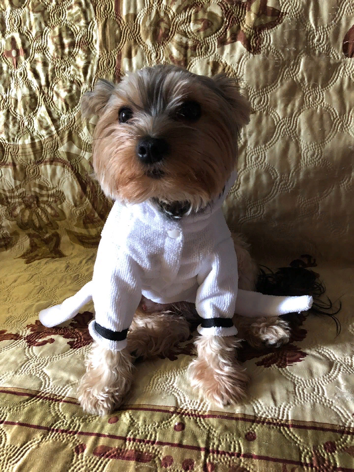 Гав! У меня радость! Я пошёл спать, а моей хозяйке пришла смс- доставили мой халатик . Она ушла на почту, а я ждал свою обновку. Как она вернулась, сразу же стал мерить. Как вам мой халатик?