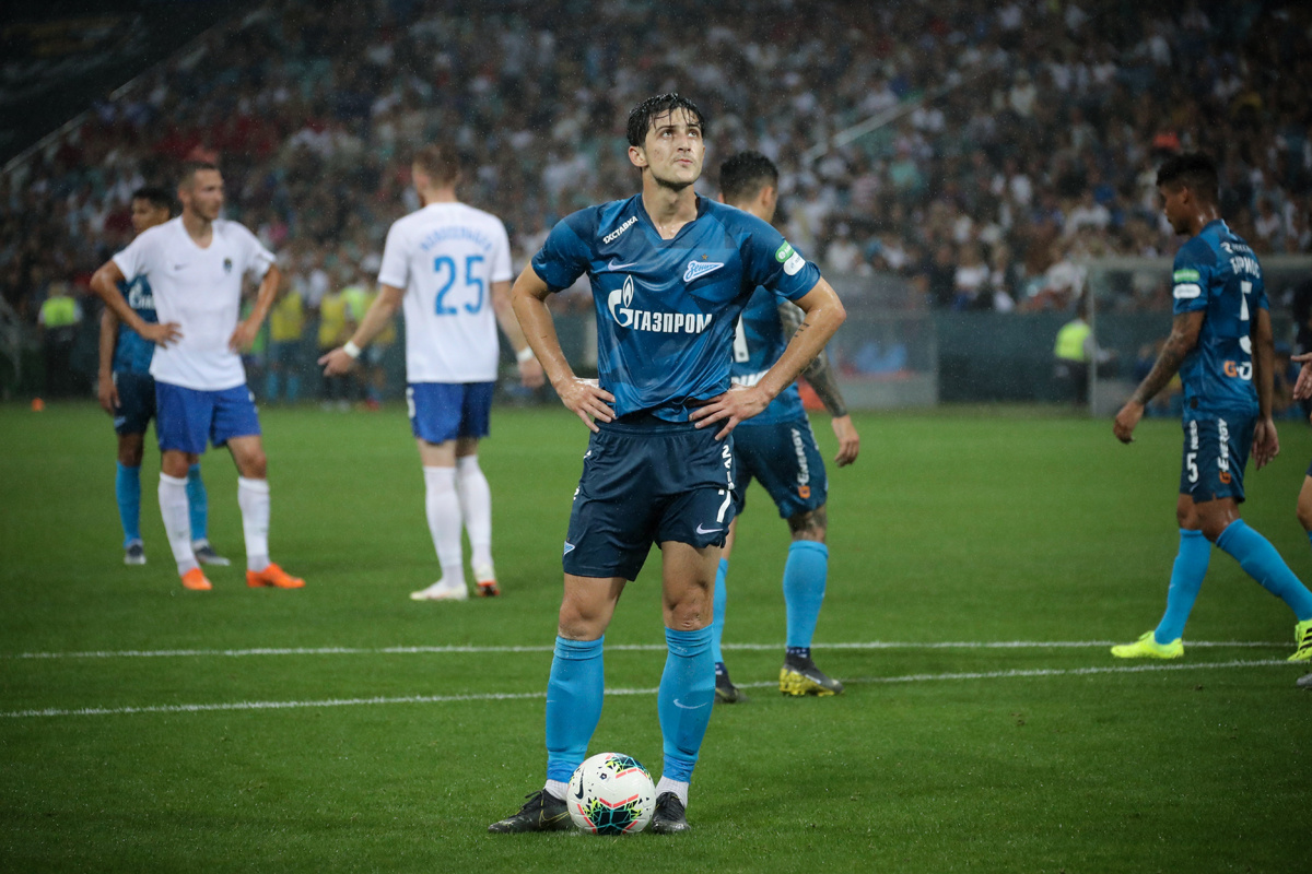 Первый домашний матч в Сочи явился для города большим праздником. На трибунах собралось более 30тыс. зрителей. Омрачила праздник только погода, - непрекращающийся ливень пошёл в самом начале встречи, но на качество игры существенно не повлиял. Гости вышли на игру с изменениями в составе, по сравнению с прошлой игрой. Новичок Сутормин дебютировал в основном составе. Дзюба остался на скамейке запасных. Зенит начал встречу ярко. Много комбинировал, быстро переходил из обороны в атаку. Особенно заметен был Сердар Азмун. Как раз таки он откликнулся на проникающую передачу из глубины поля и вышел один на один с вратарём, заработав пенальти, которое сам же и реализовал. Игра Сочи отличалась от того футбола, который команда показывала со Спартаком в первом туре. Хозяевам удавались редкие выпады к штрафной питерцев, но и они ничем опасным не запомнились. Лишь чудовищный промах капитана команды Песегова бросился в глаза, когда счёт был 0-1, забей он тогда, игра бы, наверное, пошл