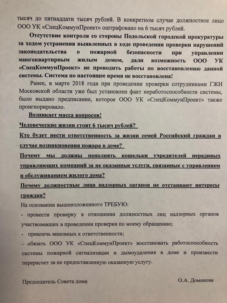 Председатель совета многоквартирного дома №8 по улице Академика Доллежая, что в новом подольском микрорайоне Кузнечики, написала жалобу на управляющую компанию аж самому Президенту РФ, добавив в адресаты ещё и Генпрокурора Чайку. Фото письма находится в соцсетях в районном паблике. Поводом для столь высокого обращения стало недовольство работой УК «СтройКоммунПроект», а именно – восстановление работоспособности систему пожаротушения, дымоудаления и противопожарной сигнализации. Уже получив ответ от Подольской городской прокуратуры о возбуждении административного дела в отношении УК о нарушении требований пожарной безопасности по статье 20.4 ч.1 КоАПП, гражданка выражает недовольство тем, что должностных лиц ООО УК «СпецКоммунПроект» оштрафовали всего на 6 тысяч рублей. Но главное, о чём утверждает автор обращения к главе государства – то, что местной прокуратурой не был проконтролирован ход восстановительных работ и ничего для исправления опасной ситуации со стороны управляющей компани