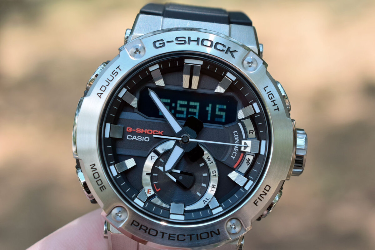 Лично я остался очень доволен GST-B200-1A. Комфортные размеры и легкость корпуса, несмотря на металл, сыграли решающую роль в моем видении серии. Не волнуйтесь, стали здесь по-прежнему много — безель, винты, кнопки, крепление ремешка создают общую картину элитных часов, хоть модель и не относится к верхнему премиум-сегменту. Беспроводные возможности и солнечное питание были и у GST-B100, но вот карбоновая составляющая однозначно выводит 200-е на новый уровень — как в плане удобства, так и прочности.