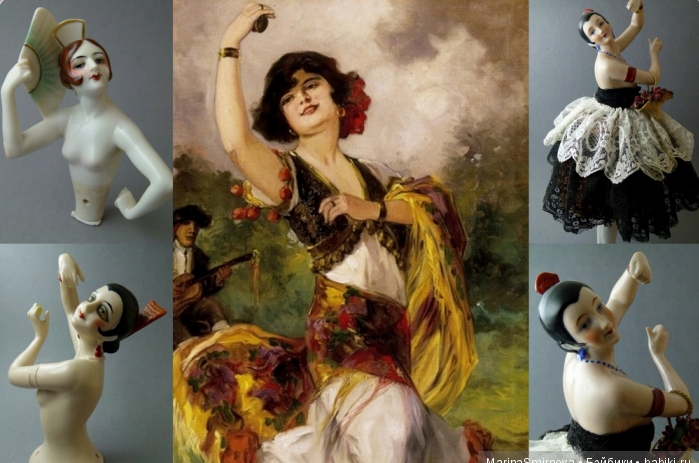 Ни одно из многочисленных фарфоровых производств Германии не обошло своим вниманием этнические/национальные мотивы. В центре этого внимания оказались очень колоритные испанские сеньориты и танцовщицы фламенко. Есть много разновидностей кукол-половинок, изображающих испанских дам, одетых в мантилью, закрепленную высоким гребнем. Некоторые из них держат в руках кастаньеты. Такие испанские сеньориты нашли своё место в ассортименте практически каждого немецкого производителя. Они производились в различных размерах, красиво одетыми или обнаженными. Кукла с белым высоким гребнем произведена мануфактурой Dressel Kister & Co (Дрессель Кистер & Co), Пассау, Бавария, Германия; кукла, одетая в черно-белое кружево, — Hertwig & Co (Гертвиг), Тюрингия, Германия; кукла с красивыми, очерченными серым, глазами и красным высоким гребнем — производства фарфорового завода Fasold & Stauch (Фасольд и Штаух), Бок Валлендорф, Тюрингия, Германия. Обе, прекрасная кукла -половинка — дама в кремовой мантилье (