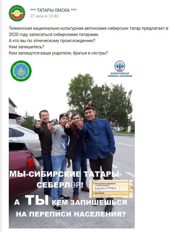 Пока ещё до переписи 2020 года далеко, но в сообществах сибирских татар "Вконтакте" уже закипела пропаганда и агитация записаться на предстоящей переписи сибирскими татарами. Пока что никаких аргументов из Казани в пользу того, чтобы сибирские татары оставались в составе большого татарского народа не звучат. К сожалению, соотношение сибирских татар против простых татар удручает. Неужели всё так плохо?