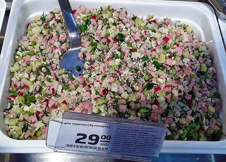 Например,я взяла "Набор для окрошки"-за 100 грамм цена 29 рублей.Это вполне нормальная цена,я считаю.Многие хозяйки просто не успевают всё приготовить,ведь рабочий день занимает большую часть дня и это палочка-выручалочка купить готовую продукцию.