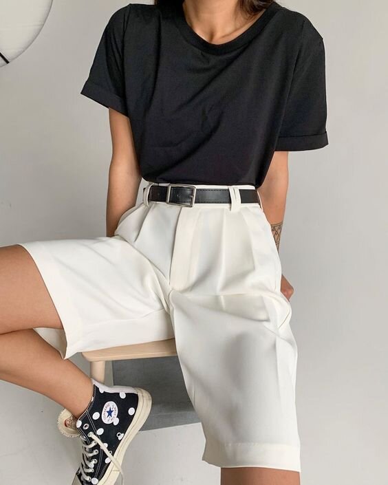 Обойдемся сегодня без исторического экскурса - откуда и и как бермуды "поселились" в наших гардеробах. Перейдем сразу к практической части - с чем же их носить! Смотрим? Идея №1 Открывает копилку идей хит сезона - костюм с шортами. Бермуды в такой комплектации смотрятся идеально. Фасон выбирайте такой, чтобы шорты напоминали обрезанные офисные брюки. Обыгрывать в образе такую двойку лучше всего в уклоном в минимализм. А еще круче - с маскулинной подачей, но это уже на любителя, конечно. Костюм в мужском стиле, открывающий стройные женские ноги - это максимум элегантности, море шарма и просто бомба с точки зрения эстети