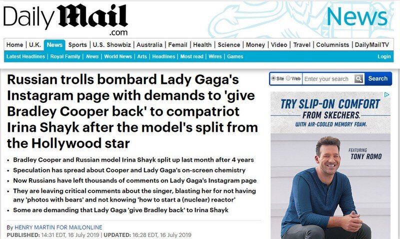 "Где заказать Юру Шатунова?"и "У меня медведь второй день от меда отказывается, что делать?!" - что произошло на странице певицы по мнению жителей США Американские СМИ назвали пользователей из России, которые оставили комментарий на странице певицы, платными троллями. “Российские тролли бомбардируют страничку Леди Гага в Инстаграм с требованиями “вернуть Брэдли Купера” их соотечественнице Ирине Шейк после того, как модель рассталась со звездой Голливуда” – с таким заголовком вышел вчерашний Daily Mail. – Русских пользователей Инстаграм невозможно остановить, – заявил по этому случаю 360 TV. Напомним, что актер Брэдли Купер и модель из России Ирина Шейк расстались в прошлом месяце после четырех лет отношений.