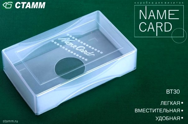Новинка! Коробка для визиток Name card от компании СТАММ! Коробка Name card предназначена для хранения визиток. В основании коробки имеется отверстие для удобства извлечения визиток. Идеально подойдет для офиса, выставок и конференций. Вмещает до 60шт визиток. Размер 60х98х19мм. Изготовлена из сертифицированного полипропилена. Источник - kanzoboz.ru