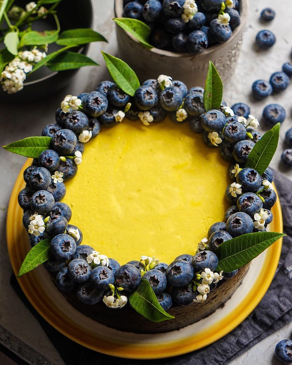 - Осталось украсить чизкейк ягодами черники и листиками мяты и десерт готов.