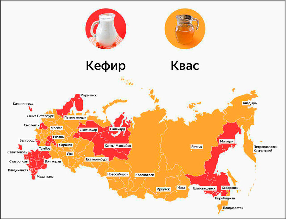 Сейчас пора огурцов на даче, что навевает мысль о том, чтобы сделать окрошку. Этот холодный суп любим россиянами. Все-таки национальное блюдо. Правда, его рецепт несколько отличается по стране. По основным ингредиентам разночтения практически отсутствуют. Здесь все стандартно: Полученный таким образом набор готовых продуктов останется только залить определенной жидкостью. Обычно в России для этого используют квас. На втором месте идет кефир. Именно это отражено на карте, что приведена в начале поста. Там красненьким отмечены регионы, где проживают любители кефира, а оранжевым – кваса. Инфо! Статистика на карте – это подсчет числа соответствующих запросов (кефир, квас) со словом «окрошка» за период с января 2018 года по май 2019 года в поисковой системе «Яндекс». Что касается других заправок для окрошки, то они могут быть следующими: В этом случае для фантазии нет предела.