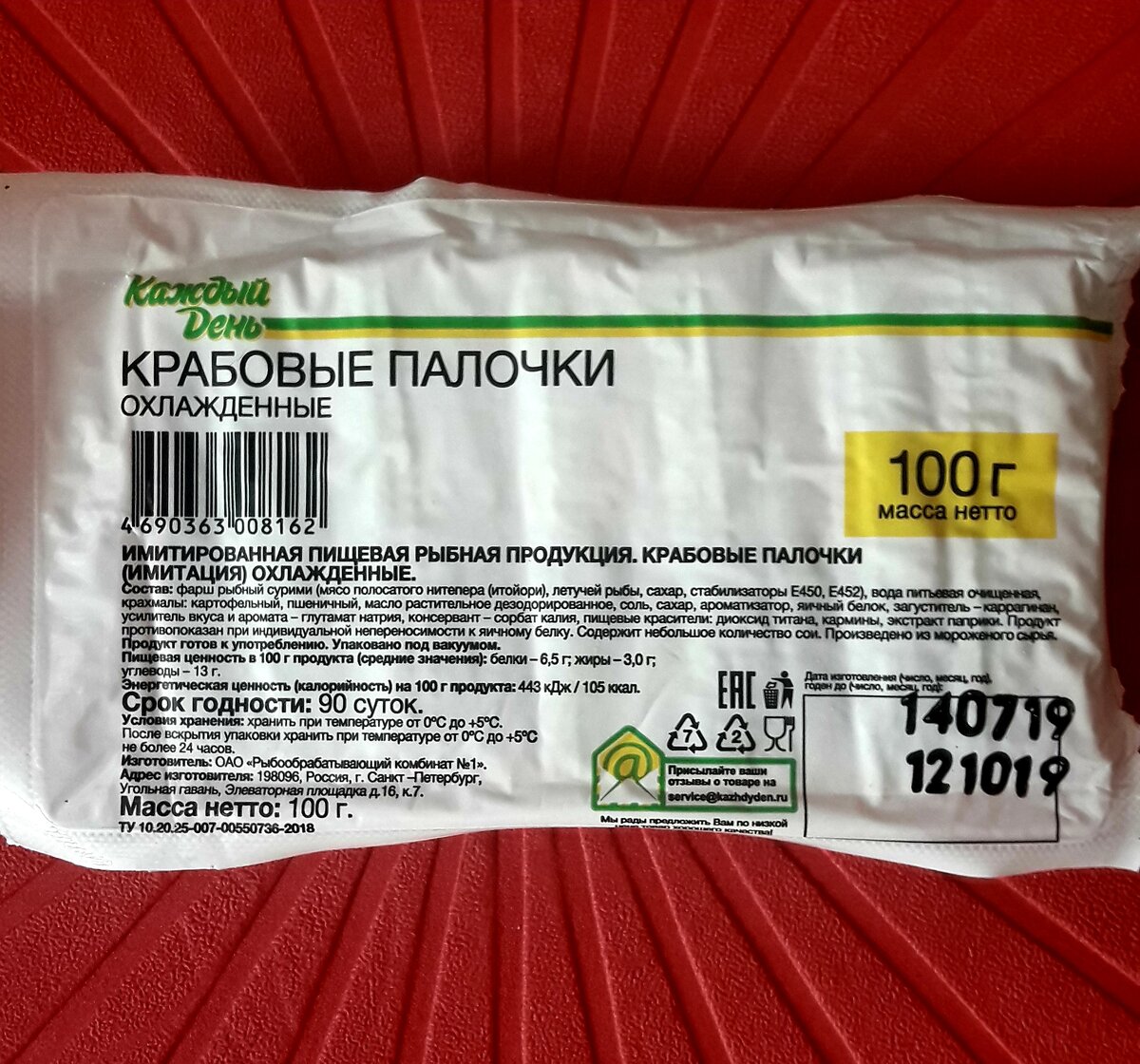 Здравствуйте, уважаемые подписчики и читатели! Сегодня Вашему обзору представляю крабовые палочки от торговой марки "Каждый день". Купил я их в "Ашане" за 19 рублей 100 грамм. Естественно, крабовые палочки - это совсем та еда, которую можно похвалить или рекомендовать для ежедневного питания. Посмотрим, есть ли отличие от более дорогих производителей или нет. Начинаю свой обзор. Имитированная пищевая рыбная продукция. Крабовые палочки (имитация) охлажденные. Состав: фарш рыбный сурими (мясо полосатого нитепера (итойори), летучей рыбы, сахар, стабилизаторы Е450, Е452), вода питьевая очищенная, крахмалы: картофельный, пшеничный, масло растительное дезодорированное, соль, сахар, ароматизатор, яичный белок, загуститель - каррагинан, усилитель вкуса и аромата- глутамат натрия, консервант -сорбат калия, пищевые красители: диоксид титана, кармины, экстракт паприки. Содержит небольшое количество сои. Произведено из мороженого сырья. По-моему мнению, состав практически одинаков, что у более дор