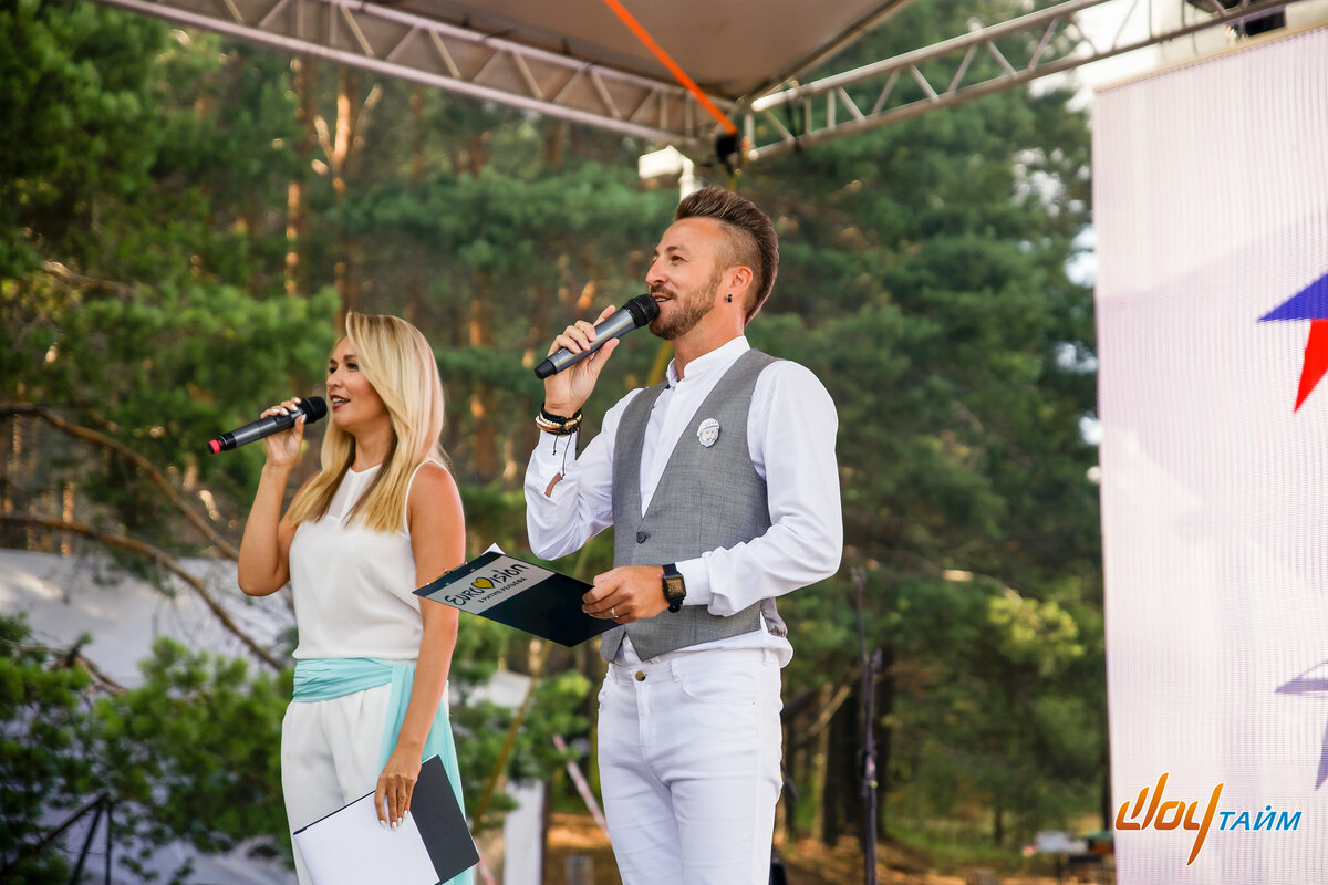 Ведущие наших шоу выбираются в зависимости от характера, тематики мероприятия, его целей и задач, и конечно, состава гостей! Например, на этом фото Евгения Четвертакова — замечательные поющие ведущие Юрий Леонтьев и Ирина Кобзева, идеально, на наш взгляд, подходящие для современного и демократичного песенного конкурса в формате #eurovision. Июль 2019-го года.