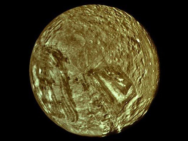 Миранда, также называемая Ураном V, является самым маленьким и самым внутренним из пяти круглых спутников Урана. Он был обнаружен Джерардом Койпером 16 февраля 1948 года в обсерватории Макдональда и назван в честь Миранды из пьесы Уильяма Шекспира «Буря». Миранда была обнаружена с помощью телескопа Отто Струве. Движение вокруг Урана было подтверждено 1 марта того же года, что сделало его первым спутником Урана, обнаруженным почти за столетие (предыдущими были Ариэль и Умбриэль, которые были обнаружены в 1851 году Уильямом Ласселлом). В соответствии с названиями других лун, изложенную Джоном Гершелем, который предложил, чтобы все большие луны Сатурна – Ариэль, Умбриэль, Титания и Оберон – были названы в честь персонажей из произведений Уильяма Шекспира и Александра Поупа. Размер, масса и орбита Миранды Со средним радиусом 235,8 ± 0,7 км и массой 6,59 ± 0,75×1019 кг Миранда составляет 0,03697 размера Земли и примерно 0,000011 её массы. Скромный размер спутника Урана также делает его