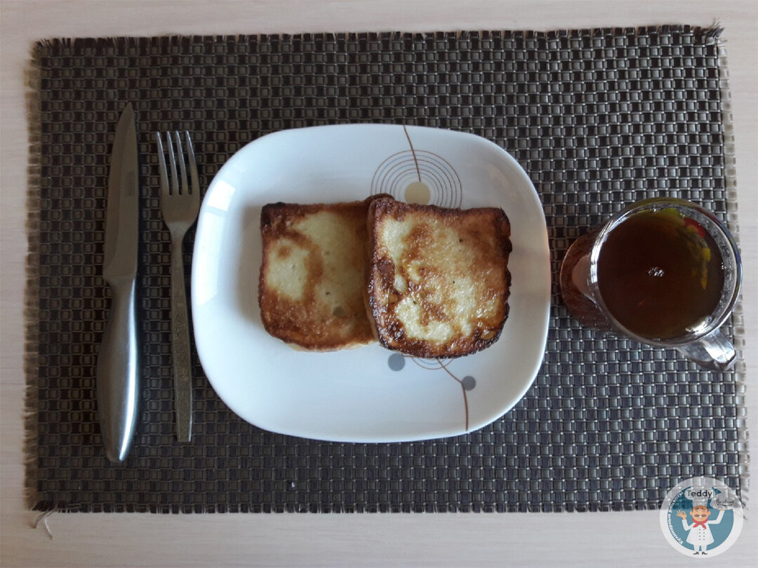 5. Немного растительного масла (лучше сливочное) (~2 руб.) Итого завтрак на двоих получиться около 18 рублей 1. Берем 2 больших яйца и разбиваем в тарелку 2. Добавляем туда 3 чайных ложки сахара 3. Тщательно перемешиваем содержимое до образования однородной массы. 4. Наливаем подсолнечное масло (по возможности сливочное) в сковороду и нагреваем до рабочей температуры на большом огне. 5. Далее берем тост и с двух сторон пропитываем яйцом с сахар