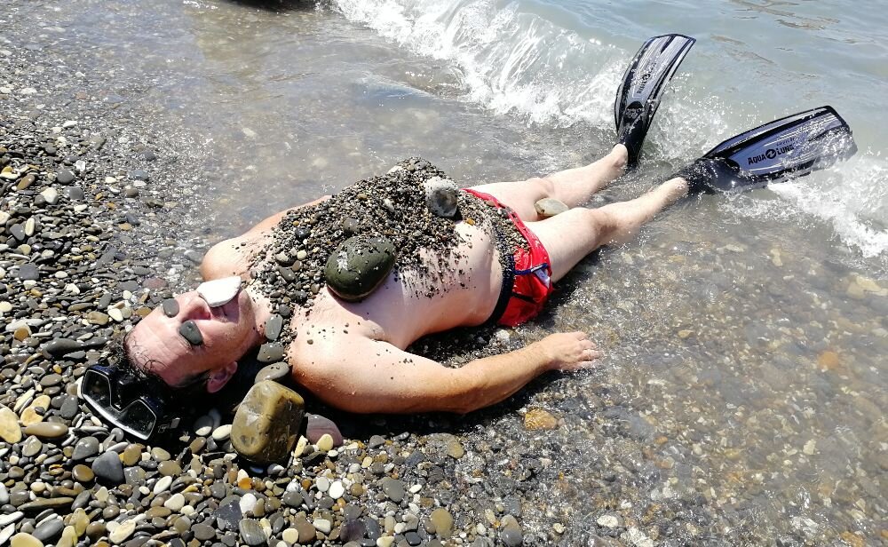 Если забыли дома сланцы или пляжную сумку, тоже не проблема – всё это можно купить на местном рыночке. Я так и сделала – без тапочек для гальки ходить по каменистому берегу трудновато. Лежать на камнях тоже удовольствие на любителя, зато попутно получаешь качественный массаж)