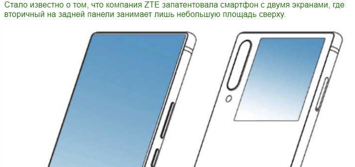 Источник: Новостной Терминал В рубке технологии Новостной Терминал в статье "ZTE запатентовал смартфон с двумя экранами" освещает новый патент на смартфон от компании ZTE. Отличие конструктивного решения в теле патента заключается в необычном формате и расположении дополнительного экрана устройства, размещенного на тыльной стороне гаджета. Патентное решение было зарегистрировано соответствующим профильным государственным учреждением на прошедшей неделе. Изображения, в приложении к патенту, дают представление и о других элементах устройства. Смартфон, по всей видимости, может заинтересовать пользователей.