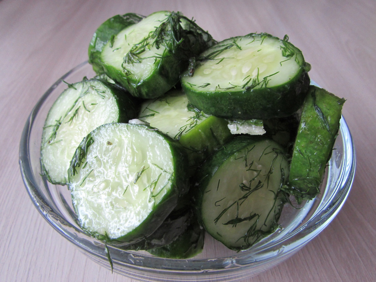 Ингредиенты: огурцы - 900г, чеснок - 2 зубчика, перец черный горошек - 3 шт, укроп - пучок, соль - 1 ст.л. Приготовление: Огурцы замочить в холодной воде и оставить на 1-2 часа. Воду слить. Нарезать огурцы кружочками. Положить их в полиэтиленовый мешок, добавить туда укроп, перец горошком, чеснок, соль. Мешок завязать и потрясти. Отправить в холодильник на 1 час.