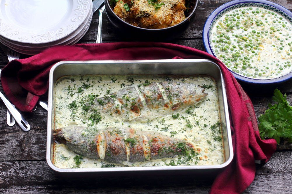 Очень сочная, нежнейше-сметанная рыбка с морским ароматом. Чтобы сбалансировать вкус соуса и придать нужную сладость, без добавления сахара, я смешала сметану со сливками 30%. При желании, можно готовить форель только на сметане, но это, в случае домашней сметаны, которая отлично переносит термическую обработку. К магазинной, если будете готовить только с ней, без сливок, нужно добавить 1 ст.л. муки, поскольку она слишком быстро сворачивается. Ингредиенты: - 2 небольшие рыбки кеты (в идеале серебрянка, так как она меньше). Помыть и почистить. - 2 ст.л. растительного масла - 150 мл сметаны (в идеале домашней, а если такой нет, то магазинной 20%) - 150 мл сливок 30% - 5 зубчиков чеснока - Соль по вкусу - 1 небольшой пучок укропа, мелко порезать 1) Духовку разогреть до 200 ᵒС. 2) Рыбу посолить по вкусу и сделать с каждой стороны по 3 глубоких надреза. 3) Жаропрочную посуду смазать растительным маслом, выложить в посуду рыбку и смазать поверхность рыбы растительным маслом. Вставить