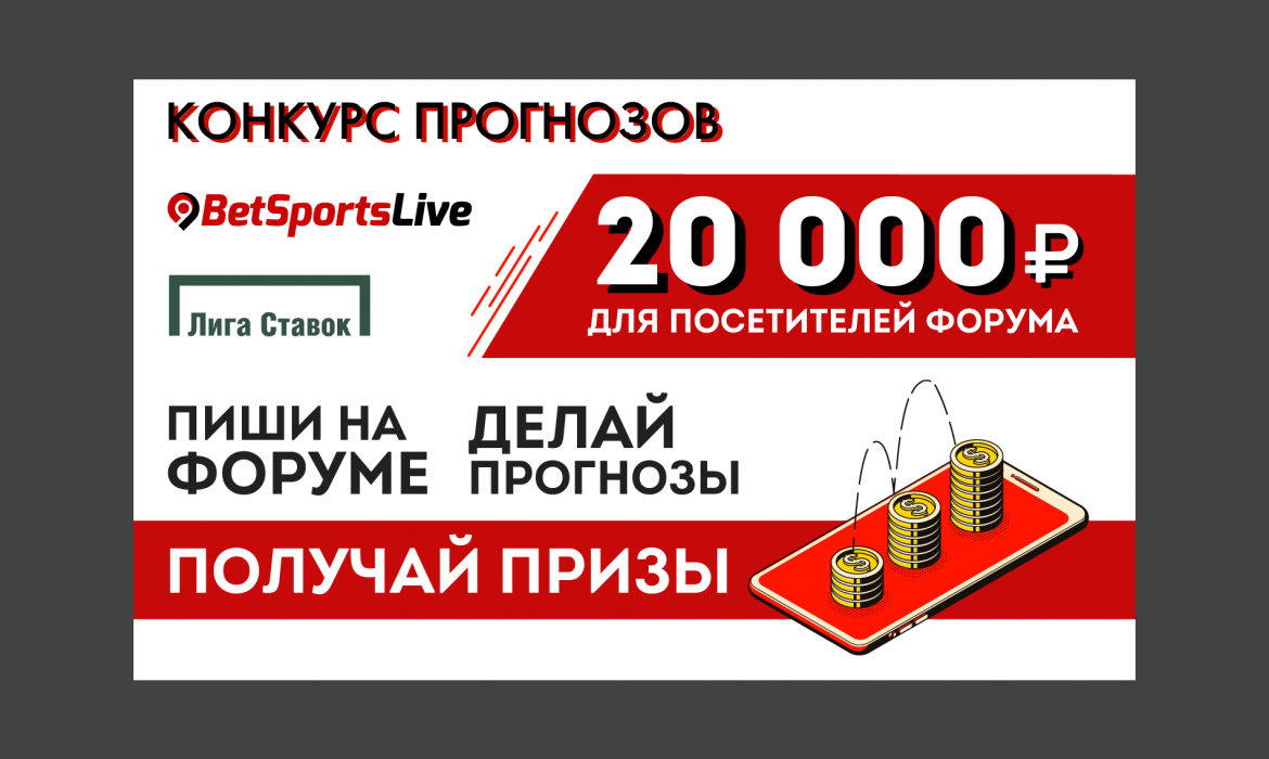 БК «Лига Ставок» и форум BetSportsLive проводят совместную акцию — КОНКУРС ПРОГНОЗОВ. Призовой фонд — 20000 рублей. Конкурс проходит с 20 июля по 20 августа 2019 года.