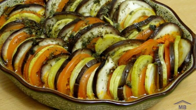 Оно не зря получило широкую популярность во всём мире. Не секрет, что овощи — кладезь витаминов. А блюда, приготовленные из них, всегда получаются вкусными и сытными! Ингредиенты: 1 кабачок, 2 баклажана, 4 помидора, 1 зубчик чеснока, соль, перец, прованские травы, оливковое масло — по вкусу. Для соуса: 2 помидора, 1 морковка, 1 лук, 2 сладких перца, 2 зубчика чеснока, 2 чайные ложки сахара, прованские травы, чёрный перец, соль — по вкусу, оливковое масло — для жарки. Процесс приготовления: Сначала готовим соус. С томатов снимаем кожицу. Для этого в верхней части томатов делаем крестообразный надрез и заливаем их кипятком. Подержав томаты 1-2 минуты в кипятке, кожица легко удаляется. Нарезаем их кубиками. Также кубиками нарезаем перец. Лук мелко крошим, морковь трём на крупной тёрке, измельчаем чеснок. На разогретой сковороде с маслом обжариваем лук до золотистого цвета. К луку добавляем морковь со сладким перцем, слегка обжариваем. Добавляем к массе томаты и тушим до готовности (под к