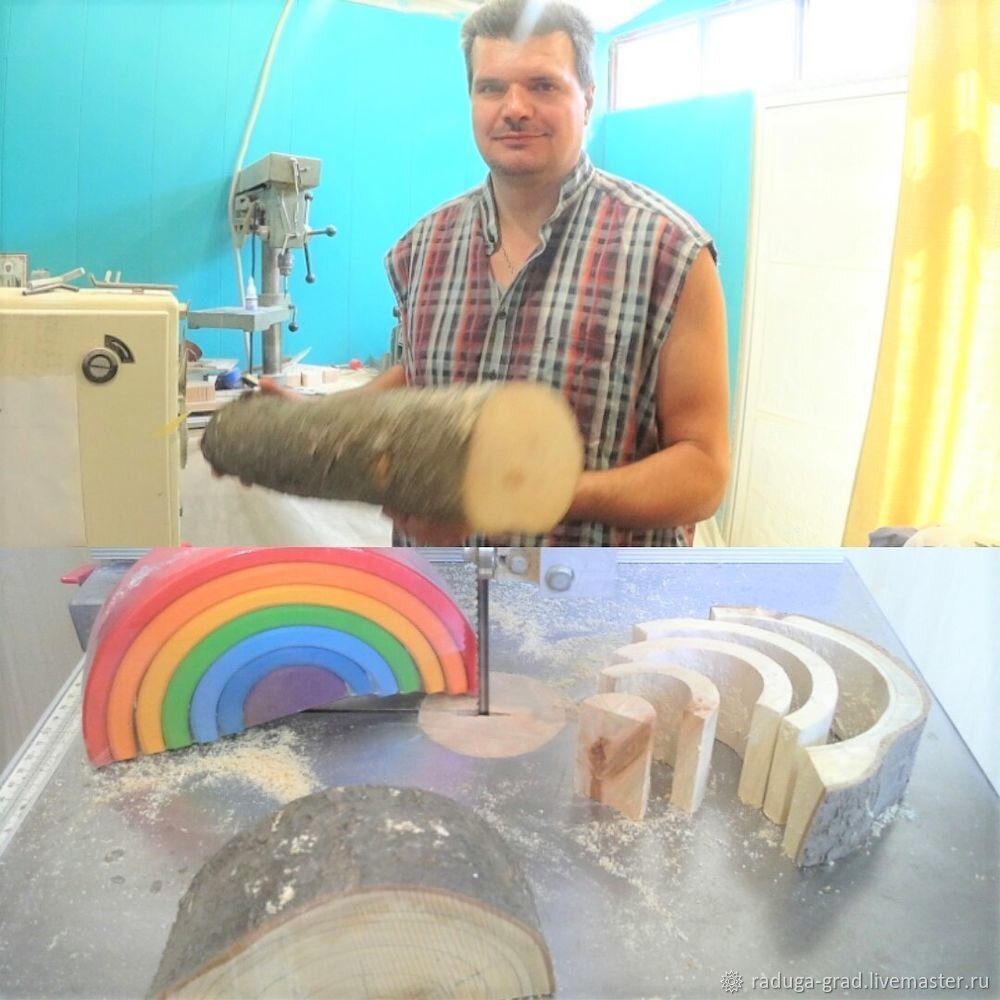 Сегодня делаем радугу с корой в вальдорфском стиле! Попалось мне удивительно подходящее бревно: сухое и небольшого диаметра. Давно хотел провести авторский эксперимент и сделать радугу с корой, чтобы посмотреть на прекрасный визуальный эффект коры под маслом. Видел кубики с корой у других производителей, но радуг не видел ни у одного из них. Чем закончился мой эксперимент, Вы узнаете, дочитав статью до конца, а пока расскажу об очевидных плюсах этого метода, которые я увидел. ПЛЮСЫ на первый взгляд: Бревно найти лично мне легко, нет лишних расходов на услугу распила на доски, очевидно не нужен рейсмус. Подготовка заключается только в грамотной сушке. Я нашел сухое бревно, а значит материал бесплатный, практически валяется под ногами. Плюсы на первый взгляд: При использовании досок я всегда ограничен по ширине радуг из-за толщины доски. Используя бревно я могу делать радуги ориентируясь на рабочую высоту пильного полотна моего станка.вальдорфские игрушки невероятно привлекательно