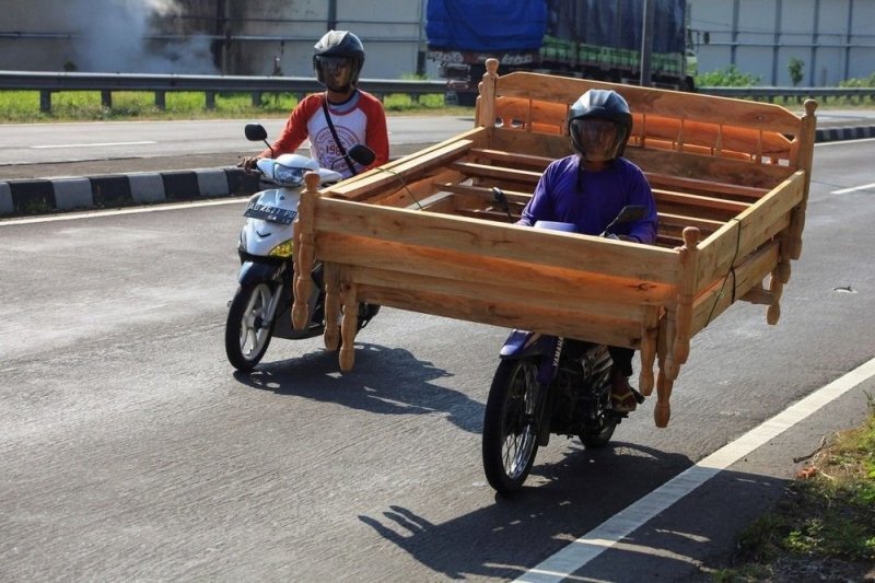 Эти водители бросили вызов законам физики, когда решили перевезти грузы, для которых их транспортные средства совершенно не предназначены. И у них это получилось! А вы всё еще часами упаковываете сумки перед поездкой на дачу? Не забывайте также посмотреть предыдущую часть >> Владельцы мопедов неоднократно удивляли меня своим креативным подходом к грузоперевозкам. Кажется, они готовы перевезти на своем крошечном байке всё что угодно, словно муравьи, которые тащат в муравейник груз, намного превышающий собственный вес. Посмотрите, как этот парень везет на обычном мопеде сразу три каркаса для кровати. Тут на автомобиле-то не знаешь, как довезти! Не бывает эвакуаторов для лимузинов. А ведь они тоже ломаются. Как тогда доставить сломанный автомобиль до ремонтной мастерской? Можно попробовать на тросе, а можно затащить на самый обычный эвакуатор. И пусть задняя часть беспомощно свисает и болтается. Главное — привязать покрепче! Моя жена просто фанат пакетиков. Она всё хранит в пакетах, и со