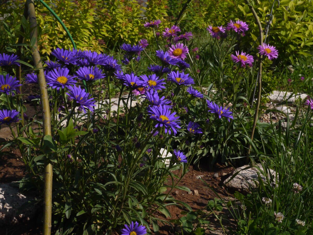 Сад моей мечты. Каким он стал 6 лет спустя, то вы знаете, что у нас есть декоративные подпорные стенки из природного камня. Мы начали подбирать цветы, которые бы украшали их. Для этого подобрали альпийские астры различных окрасок. Цветок довольно яркий и веселый, но цветет очень непродолжительно, максимум 2 недели. После этого остаются не совсем привлекательные кустики.