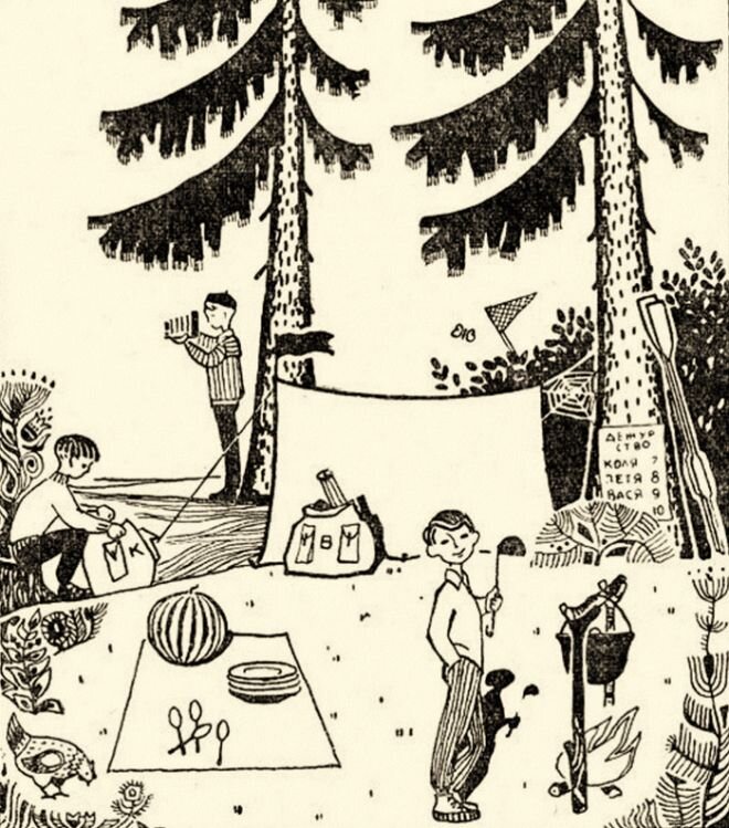 Данную картинку давали детям во времена Советского Союза и задавали несколько вопросов для проверки их логики и внимательности. Попробуйте и вы ответить на них. В конце статьи будут правильные ответы. Проверьте свою сообразительность. Вопросы: 1. Сколько туристов живет в лагере? 2. Туристы приехали сюда сегодня или несколько дней назад? 3. На чем они сюда приехали? 4. Далеко ли от этого лагеря до ближайшего селения? 5. Откуда дует ветер? С севера или с юга? 6. Какое время дня изображено на картинке? 7. Куда ушел Шура? 8. Как звали дежурного, который дежурил вчера? 9. Какое на картинке число и какого месяца? (Запишите свои варианты ответов и сверьте их с правильными ниже) Ответы: 1. 4 человека. (Это можно понять по ложкам, тарелкам и списку на дереве) 2. Несколько дней назад, так как между палаткой и деревом уже образовалась паутина. 3. На лодке. (Весла, прислоненные к дереву) 4. Неподалеку, так как рядом гуляет курица. 5. С юга. (Короткие ветки сосен, как и мох на деревьях располагают