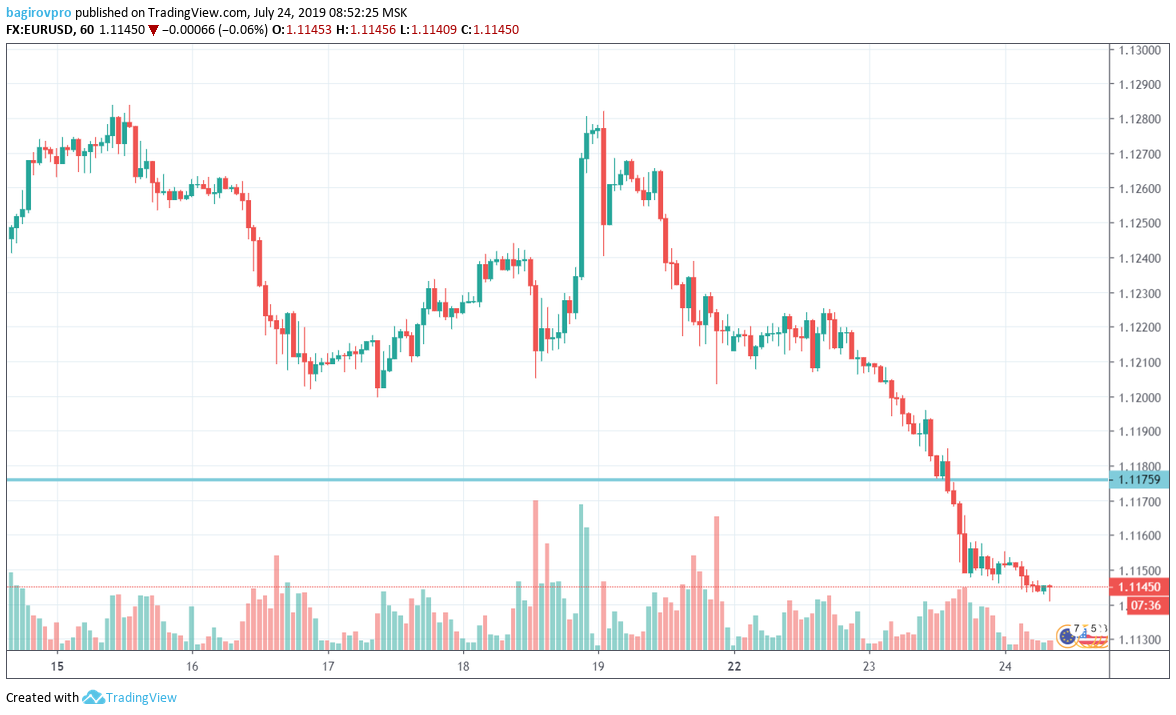 Всем привет! Как и говорил ранее перешел на торговлю всего тремя инструментами. Поэтому и анализировать буду только их. Представляю анализ рынка форекс на 24.07.2019 года. Анализ EURUSD Думаю по паре возможно некоторое коррекционное движение вверх, и дальнейшее снижение после публикации экономической статистики по еврозоне и США. На момент написания статьи стою в позиции на лонг 1.1155. Возможно цель скорректирую по ходу движения до 1.1175. После чего буду искать точку входа на шорт. Слабая статистика будет дополнительным стимулом для снижения ставки ЕЦБ на завтрашнем заседании. Соответственно пара пойдет на юг. Анализ GBPUSD Борис Джонсон новый премьер Британии добавил немного оптимизма для Фунта. Заходил, но получил небольшой стоп. Из новостей по фунту только объем ипотечных займов. И послание Терезы Мэй. Как поведет себя пара в долгосрочной перспективе прогнозировать сложно. До уровня 1.2470 Пока ищу точки входа на лонг, после уже будем смотреть по ситуации. Анализ золота. На м