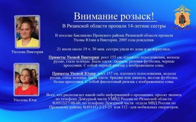 Всех, кто располагает какими-либо данными об исчезнувших сёстрах, просят позвонить по телефону Дежурной части УМВД России по Рязанской области: 8 (4912) 27-08-60, либо по телефону Дежурной части отдела МВД России по Пронскому району 8 (49141)