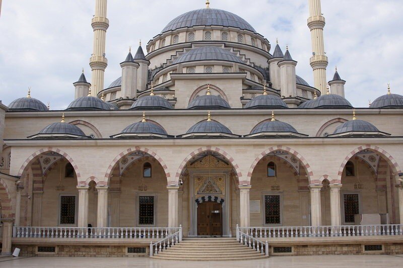 Так как дождик затянулся, а световой день заканчивался мы поспешили в город, заглянув по дороге в город Аргун (16 км от Грозного), чтобы полюбоваться мечетью «Сердце Матери». Мечеть выполнена в стиле Хай-Тек и построена в честь матери Рамзана Кадырова. Так как лил дождь, то снаружи много фото сделать не удалось, поэтому смотрите внутреннее убранство: