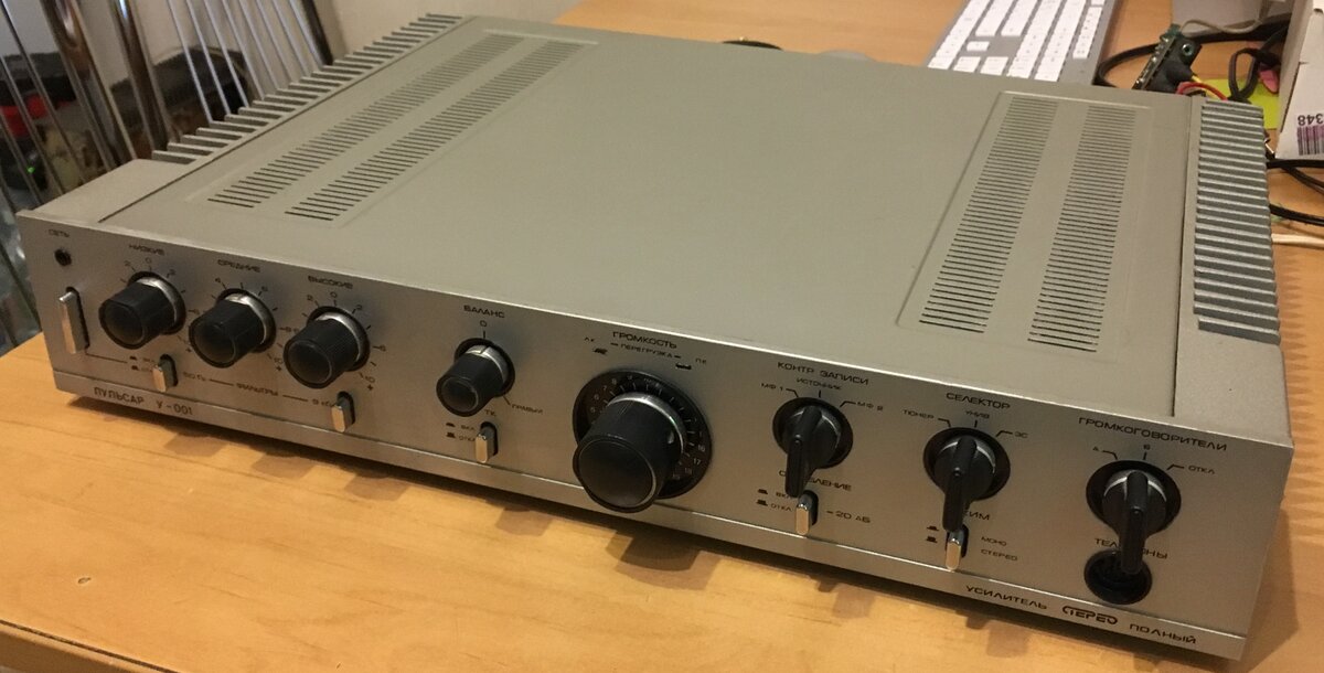 Полный усилитель, выпущен данный экземпляр в 1987 году и стоил тогда 300 руб. Одна из наиболее грамотных разработок УМЗЧ советского времени и пользовался заслуженной популярностью в свое время. Если в 80-е, во времена моей учебы в старших классах, у тебя дома была пара, типа усилитель Кумир У-001 и акустика S-90, то это в подростковых понятиях было почти также круто, как иметь японскую магнитолу:) А если был катушечник нулевого класса, то даже круче! Да и вообще, аудио техника с первой цифрой "0" на передней панели вызывала некоторый трепет в то время, а ценники ввергали в шок:)
