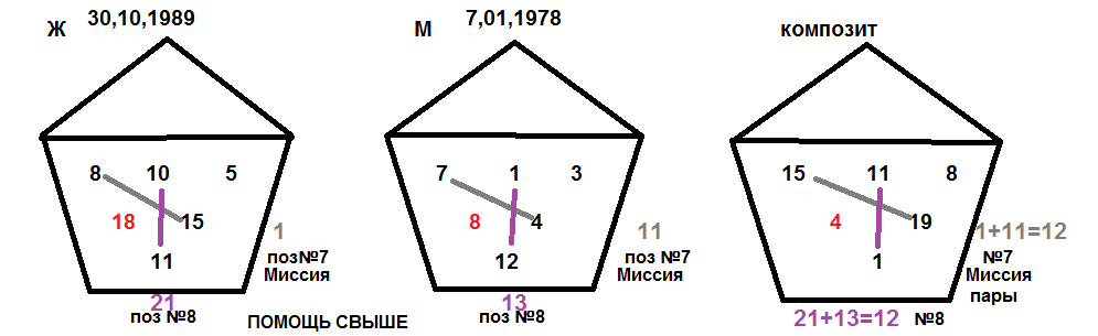Как высчитывается позиция №7? Сложением позиции 1 и 5. Т.е. сумма осознания человеком, кто он и какой он, и того, что ему дорого и важно. В результате получается Миссия. Сложив позиции №7 каждого, мы получаем Миссию пары, т.е. задачу, которую пара должна выполнить совместно. Для этого они, по сути, и встретились. Но автор метода А. Хшановская очень часто называет эту точку кармической задачей. Так что, выполнив условия задачи, люди развязывают какой-то узелок, завязанный в прошлом воплощении пусть и не друг с другом, а совсем с другим человеком. Согласитесь, что точка- очень важная. Я постараюсь написать, какие могут быть задачи по этой позиции. Но надо помнить, что любая позиция, начиная с четвёртой, составная. И поэтому у тех, у кого по итогу она одинаковая, она всё равно будет разная.