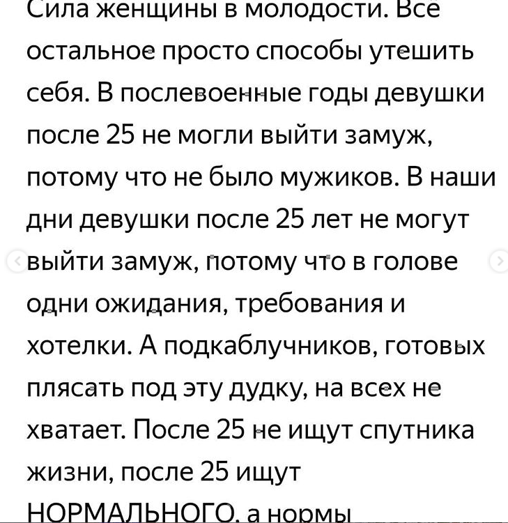 При том, что требования должны быть адекватными. Говорить, что женщина после 25 - это залежалый и проблемный товар (товар, заметьте!) это то же самое, что утверждать, будто мужчина без семизначной зарплаты - лох.