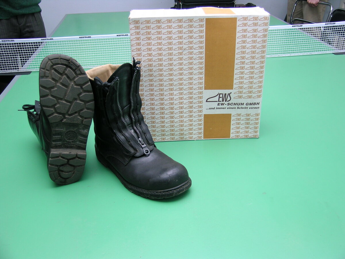 Года три назад я решил взять обувь для весеннее-осеннего сезона, ну и чтобы летом иногда, да и зимой в слякоть – короче, «три в одном флаконе». Кроме того, я собирался носить эту обувь и на работе в случае несвоевременного получения новой, выдаваемой фирмой, а так как работа связана с повышенной опасностью травматизма, то обувь выбиралась не только из расчета того, чтобы просто не промокала и не скользила на грязи, но и была усилена прочными элементами на носке и пятке. Перещупав внедорожные армейско-рабочие ботинки типа «Комбат-2» и «Маттерхорн Waterproof» отбраковал первые из-за слабого носка, усиленного только пластиком или толстой кожей (не знаю точно, что там внутри), а вторые из-за неслабой цены (около 250 долларов), я вдруг нашел в магазине на Мясницкой немецкие ботинки с надписью на коробке «EWS». Продавец заливался соловьем, когда расписывал, что они сделаны из кожи буйвола и усилены металлом не только в носке, но и в пятке и в подошве. Цена их на то время была около 120 долларов, в прошлом году видел их на ВВЦ за 3500 руб. Смутило и в тоже время подвигло на эксперимент наличие сменной вставки с молнией, которую можно установить вместо шнурков, причем в инструкции к обуви (на русском языке) было прямо указано, что основной способ носки – с молнией. Короче, под неодобрительное ворчание любимой женщины (им бы все модельную обувь подавай, да «от кутюр» - а грязь в чем месить?), приобрел.