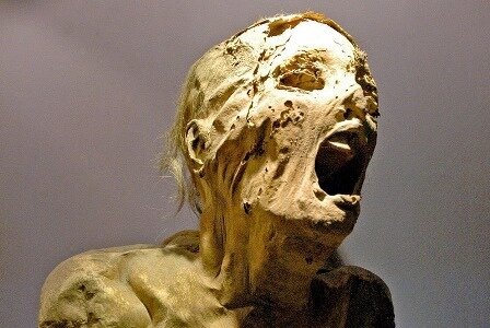 Во время мумифицирования мертвецу не подвязать челюсть, как это делалось обычно, в ходе распада тканей челюсть открывалась и на лице застывала жуткая маска. Бывало и так, что ремешок или веревка с челюсти съезжали или рвались.