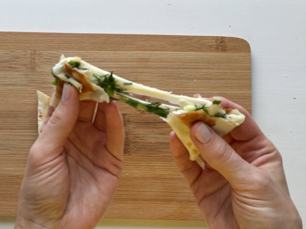 Всего три ингредиента и 15 минут на приготовление без духовки. Лаваш заменяет нам тесто, причём, без дрожжей и экономит время на раскатку, потому что уже тонкий и пластичный. Я уже готовила пирожки из лаваша с капустой. Сегодня другая начинка и новый способ заворачивания — треугольником. Давайте готовить. Ингредиенты Приготовление Лук помыть и мелко порезать. Я слегка тушу лук с небольшим количеством воды. Так из лука исчезает острота, так что если у вас нежные желудки, возьмите на заметку. Если вы спокойно едите свежий лук без последствий, пропустите этот шаг. С моцареллы слить сыворотку, порезать на кружочки, потом на четвертинки. Если у вас твёрдый сыр, то просто порежьте или натрите на крупной тёрке. Лаваш нарезать ножницами на полоски шириной 10 см. Собираем пирожки. Каждую полоску лаваша сбрызнуть водой, пройтись влажными ладонями с обеих сторон. Так лаваш станет ещё более пластичным, мы имитируем сырое тесто. Формируем треугольник. Отогните край полоски снизу вверх по диагон