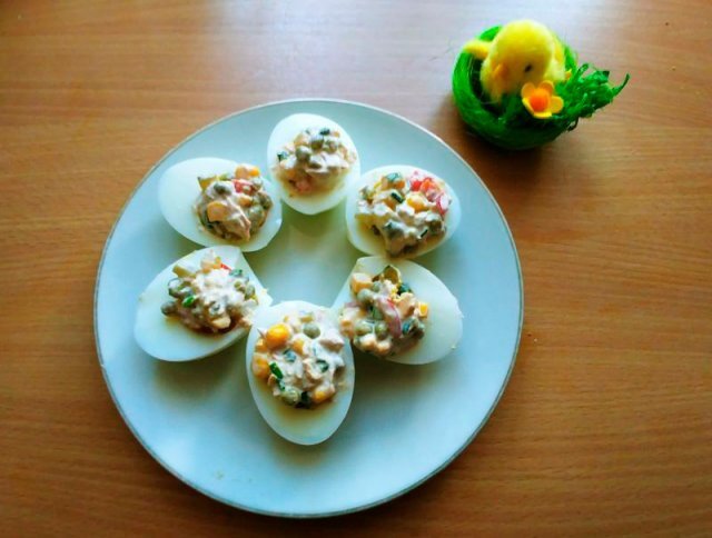 Соль, перец Приготовление фаршированных яиц: Яйца (12 шт.) варю вкрутую, даю им остыть. Перец (1/2 шт.) мою, режу кубиками. С кукурузы (1 б.) и горошка (1 б.) сливаю жидкость. С тунца (1 б.) так же сливаю жидкость и мну его вилкой. Огурцы(3 шт.) режу кубиками. Зеленый лук промываю, сушу и мелко нарезаю. Болгарский перец, зеленый лук, горошек, кукурузу и огурцы соединяю вместе в миске. Вареные яйца очищаю от скорлупы и разрезаю на половинки. Вынимаю желтки. 4 желтка нарезаю кубиками и добавляю в салат. Салат приправляю солью и перцем, добавляю майонез, перемешиваю. Подготовленные бе