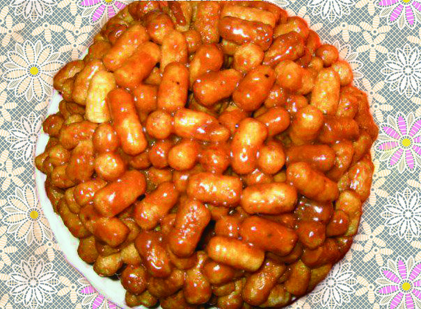 Обалденный чак-чак, детки в восторге! -175 гр. сладких кукурузных палочек (2,5 пачки по 70 гр.) - 180 гр. сливочного масла - 1 банка вареной сгущенки - 200 гр. мармелада - 50 гр. очищенных грецких орехов Кукурузные палочки высыпаем в глубокую миску. Мармелад нарезаем кубиками и добавляем к палочкам. Все перемешиваем. Далее растапливаем масло и добавляем варёную сгущёнку. Взбиваем и выливаем к кукурузным палочкам с мармеладом. Хорошенько перемешиваем. Берем форму и застилаем пищевой плёнкой, выкладываем туда горкой (муравейником) полученную смесь. Грецкие орехи измельчаем и обсыпаем торт. Окутываем наш торт пищевой пленкой и убираем в холодильник на ночь. Готово!