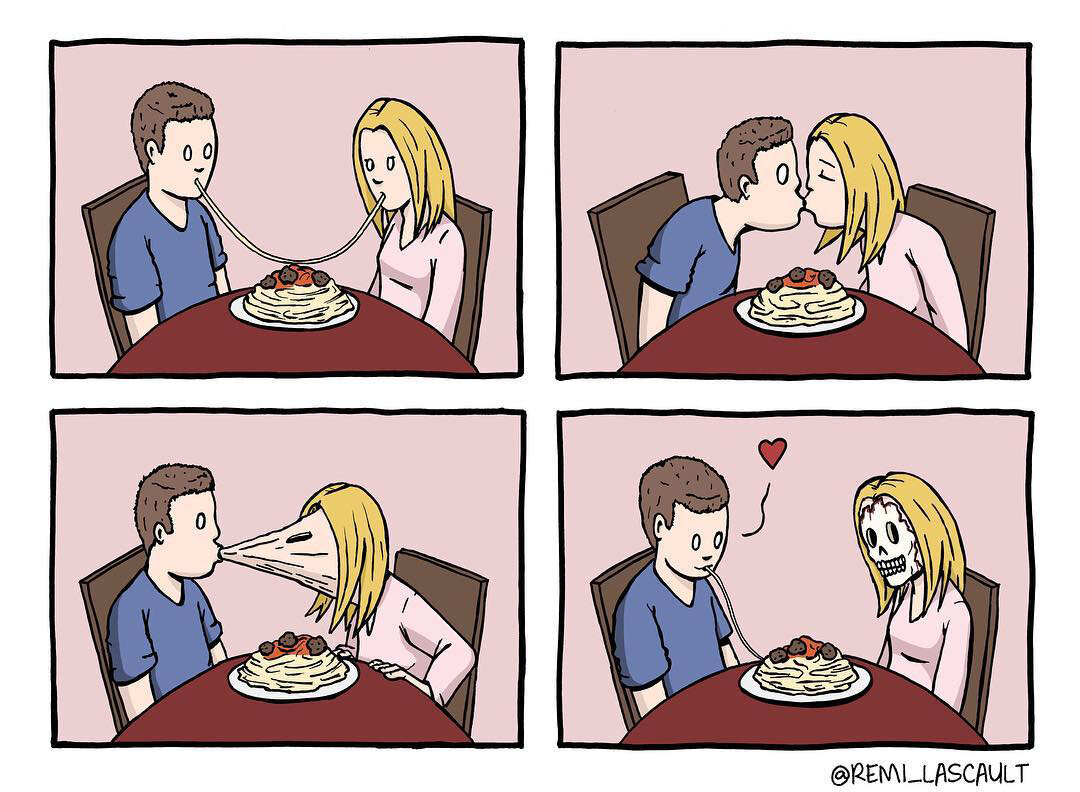 Сам автор говорит о своем творчестве следующее: «Я рисую дурацкие комиксы для людей, которые любят черный юмор». Что ж, можно ли считать комиксы Реми Ласко «дурацкими» решать только вам, ведь специально для этой статьи я отобрал несколько забавных и местами странноватых зарисовок от иллюстратора из Парижа. Если вам понравится, можете также заглянуть в Фейсбук автора, там вы найдете еще больше комиксов.