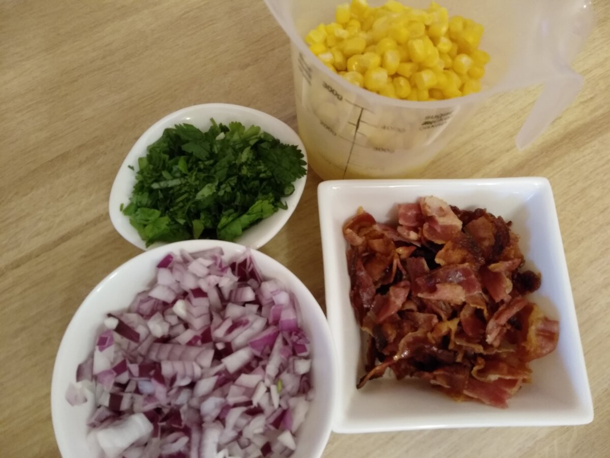 Сытный, вкусный хот-дог с островатым сырным соусом и сладкой кукурузой. На 3 хот-дога 3 булочки для хот-догов 3 сосиски дижонская горчица Кукурузная начинка: 3 полоски бекона 0,5 шт. красного лука 1чашка замороженной кукурузы 0,5 ст.л. свежей кинзы соль черный перец Сырно-томатный соус: 1 ст.л. сливочного масла 1 ст.л. муки 110 мл. молока 60 гр. чеддера 20гр. консервированного зеленого перца чили 85 гр. обработанных помидор (семена, мякоть вынуть) 1 шт. перца чипотле в соусе адобо 1 ст.л. острого соуса соль черный перец Начинаем с кукурузной начинки. Бекон жарим в духовке, при 250C или на сковороде, на небольшом количестве оливкового масла. Остужаем, крупно нарезаем. Лук нарезаем кубиками. Кинзу мелко режем. В сотейнике нагреваем небольшое количество растительного масла, обжариваем лук, буквально несколько минут. Добавляем бекон, кукурузу. Жарим 2-3 минуты. Добавляем кинзу, соль и перец, перемешиваем и снимаем с огня. Накрываем крышкой или перекладываем в миску и держим в тепле. Т