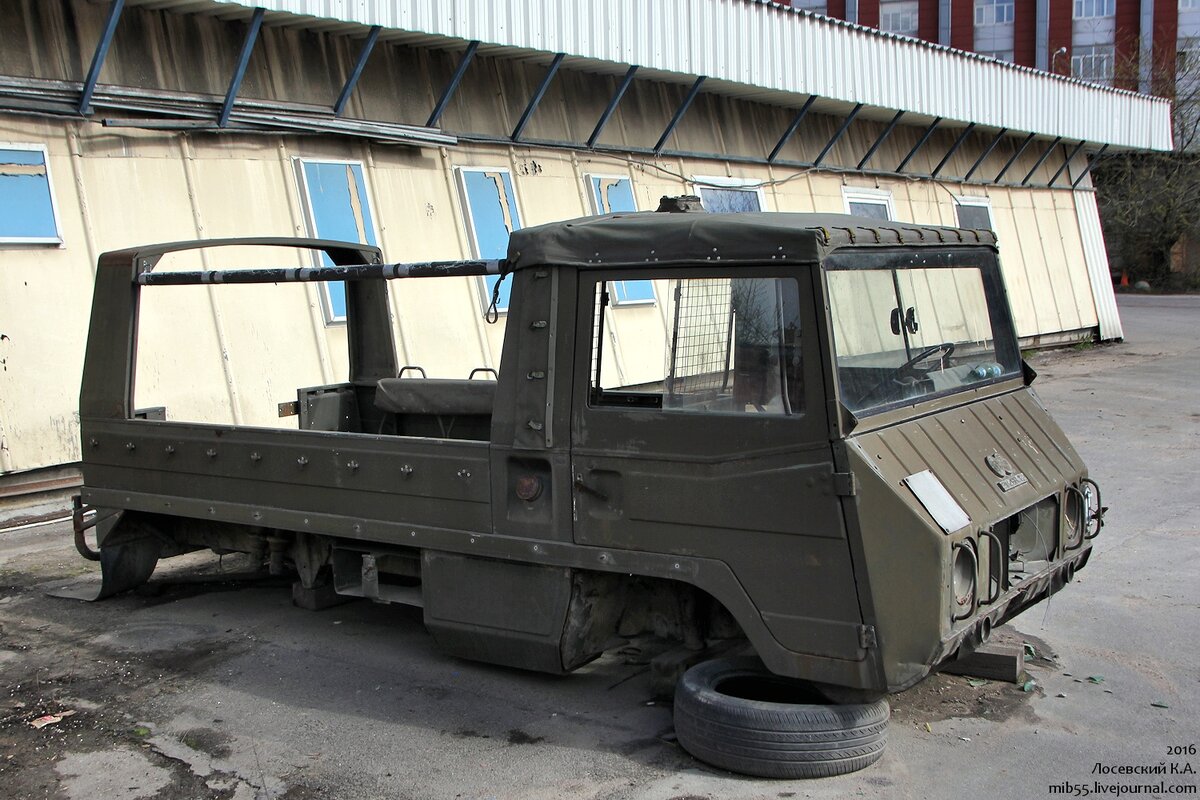 Как-то, гуляя по питерским закоулкам, наткнулся на весьма интересный объект - кузов австрийского армейского автомобиля Pinzgauer 710M. Такие машины мне в принципе встречались, но в живом виде, тем более что стоят они, даже в приличном возрасте, неплохих денег и ими особо не разбрасываются.