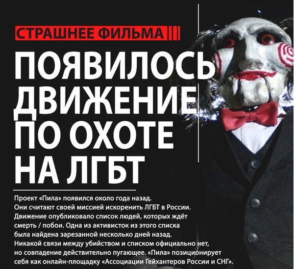 Не так давно увидел несколько статей, посвященный данному движению. Описать в одну статью весь маразм не получится, разобьем на несколько частей. И так, приступим. Проект "пила", который достаточно давно угрожает ЛГБТ-активистам по всей стране. Группировка позиционирует себя как «всероссийское движение против ЛГБТ», а его провокаторы уже нападали на геев в Башкирии (кстати, именно оттуда родом предполагаемый убийца Григорьевой).