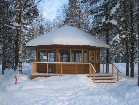 Тяжелей всего возводить зимнюю беседку в холодное время года. Почву приходится разогревать кострами, а в качестве временного навеса надо использовать мягкие окна – виниловую пленку с окантовкой. Лучше всего строить зимнюю беседку летом или ранней осенью. А при использовании пиломатериалов, особенно бревен, необходимо раскладывать их под открытым небом, чтобы они акклиматизировались.