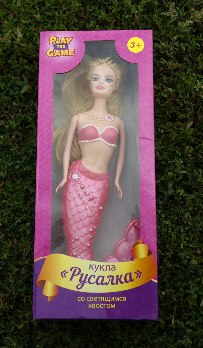 В Фикс Прайс довольно много игрушек, в том числе и кукол. Недавно дочка захотела себе вот такую куклу - русалку со светящимся хвостом. Цена 99 рублей. Куклы представлены в нескольких вариантах, у них разный цвет волос и хвоста. Дочка выбрала блондинку с розовым хвостом. Хвост у куклы светится, диоды работают от батареек, они есть в комплекте. Сзади находится включатель, он довольно тугой, но ребенок справляется. Размер игрушки - 35 см. Плавник снимается. Вот так выглядит собранная кукла. Прорисована она не плохо, руки на шарнирах. Тело у нее прорезиненное, а вот хвост пластиковый. Волосы длинные, но их, как обычно маловато и они быстро теряют всякий вид. Дочка думала, что куклу можно мочить (русалка как - никак), но этого делать нельзя, если хотите что бы хворост продолжал светиться. Светится хвост тремя цветами, светит довольно ярко, цвета мигают. За свою цену игрушка игрушка неплохая. Подойдет для детей 6+, детям младшего возраста я бы такую игрушку не купила по двум причинам. Пер