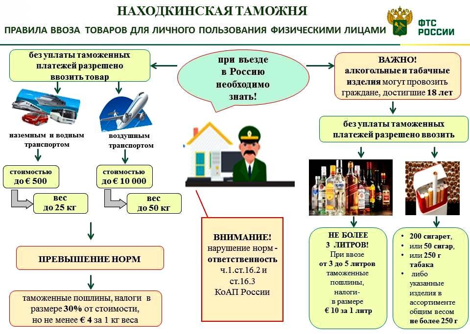 Находкинская таможня напоминает, что без уплаты налогов и пошлин физические лица в личных целях наземными и водными видами транспорта в страны Евразийского экономического союза, к которым относится Россия, могут ввезти товары, общей стоимостью не более 500 евро. При этом вес товара не должен превышать 25 кг. Правила касаются товаров, которые граждане ввозят с собой автомобильным, железнодорожным, морским и речным видами транспорта, а также в пешем порядке. В случае превышения установленных норм, гражданин должен заплатить пошлину в размере 30 % от стоимости товара, но не менее 4 евро за килограмм веса в части превышения стоимостной и/или весовой нормы. Воздушным транспортом беспошлинно разрешается ввозить товар на сумму до 10 000 евро и весом до 50 кг. Особые нормы установлены на ввоз табачной и алкогольной продукции. Физическое лицо, достигшее 18-летнего возраста, может беспошлинно ввезти алкогольные напитки и пиво не более 3 литров. В случае ввоза от 3 до 5 литров включительн