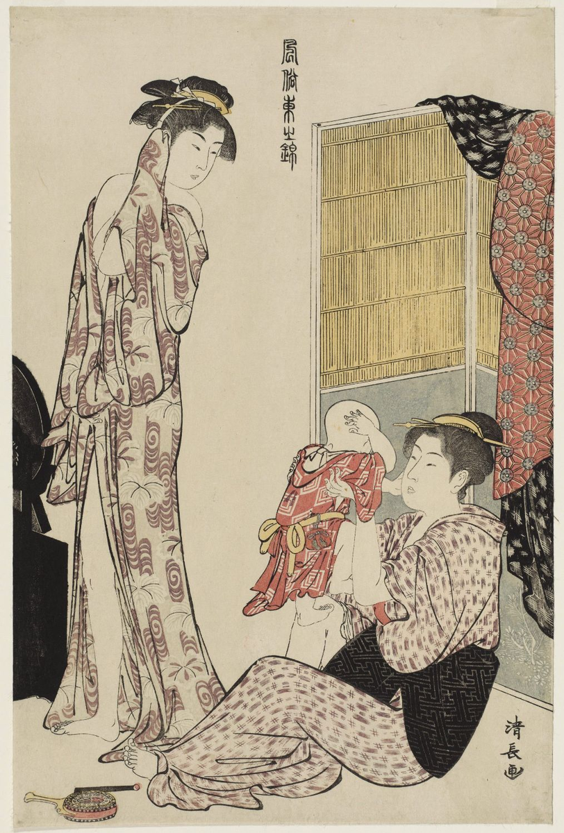 Artist:Torii Kiyonaga Title:Woman in Bathrobe and Mother Playing with Baby, from the series Current Manners in Eastern Brocade (Fûzoku Azuma no nishiki) Date:1785