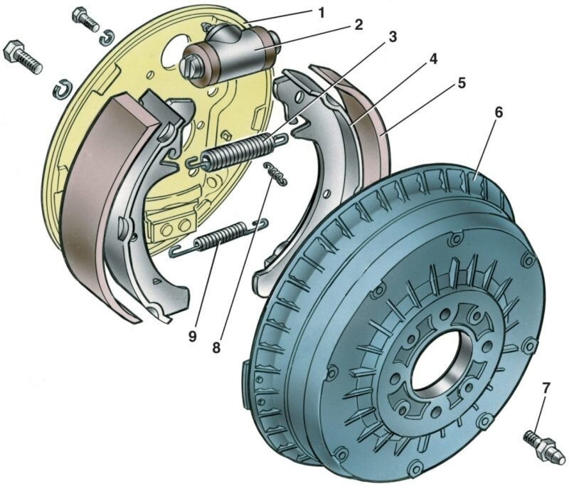 Каждый автолюбитель сталкивается с такой проблемой, когда педаль сколько не дави, а тормозов всё нет. Поднимаем машину на домкрат, снимаем колесо и видим барабан. Вот тут-то и начинаются все дела через старый и добрый русский мат. Кто-то начинает отстукивать его молотком, кувалдой, прыскать WD-40, которая знаменита на весь земной шарик, как «вэдэшка», а мы возьмем 2 гаечных ключа на 10 или 8. Почему именно два? На самом деле лучше взять ключей с собой побольше, так как понадобятся на сам рожковый механизм, а ручка, которая с увеличением размера рожка становится толще. Инструкция: 1) Берем молоток и гаечных ключ на 10. Вставляем гаечный ключ ребром между зазором самого барабана и суппорта(между деталью 1 и 6). Не залезает. Брысь по нему молотком и оказывается всё заходит. 2) Вставляем такими же движениями второй ключ на 10 на 30-40 градусов вправо или влево, как вам удобно. Что мы получили? Мы наконец-то сдвинули этот проклятый барабан с места, но он по-прежнему не снимается. Тог