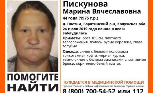 24 июля в деревне Плетни Барятинского района Калужской области 44-летняя Марина Пискунова пошла в лес за грибами и заблудилась. Сегодня в 14 часов отряд «Лиза Алерт» отправился на поиски женщины. Марину Пискунову нашли живой спустя несколько часов поисков. Напомним, по данным отряда «Лиза Алерт» в России с 15 по 21 июля заблудились в лесу 596 человек. 8 из них погибли, 19 не найдены до сих пор. Источник